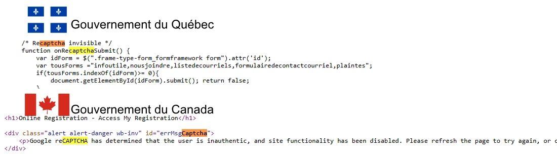 Ce qui rend la situation encore plus préoccupante, c’est que même les sites gouvernementaux québécois et canadiens utilisent reCAPTCHA, souvent sans que les citoyens ne s’en rendent compte. Une simple vérification du code source de plusieurs sites officiels a suffi pour révéler la présence de reCAPTCHA invisible en arrière-plan. Cela signifie que, chaque fois que nous interagissons avec ces plateformes pour des services essentiels – qu’il s’agisse de renouveler un passeport, remplir une déclaration d’impôt ou soumettre une demande officielle – Google enregistre nos comportements en ligne.